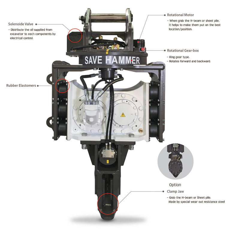It handles H-beam and Sheet pile at river stream, road wall and building construction job.
